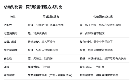 對于形狀不規(guī)則、需要頻繁維護或檢修的異形設(shè)備,使用可拆卸保溫套不是一種簡單的替代選擇,而是一種在保溫效率、維護便捷性、安全環(huán)保和長期經(jīng)濟效益上都具有壓倒性優(yōu)勢的現(xiàn)代化解決方案。它特別適用于石油化工、制藥、食品飲料、電力、新能源等對工藝溫度控制和設(shè)備維護要求高的行業(yè)。