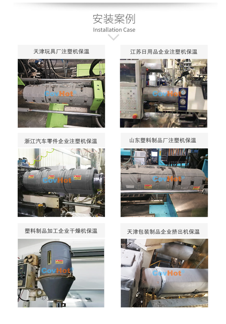 塑料制品行業的注塑機在工作時,需要對物料進行加熱處理,內部溫度高達300℃以上。注塑機節能保溫罩產品可以有效節能省電,以達到注塑機保溫隔熱的效果,從而提高加工合作率。使注塑機表面溫度降低至50℃以內,降低車間的整體溫度。